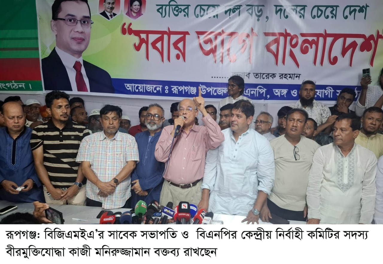 বিজিএমইএ’র সাবেক সভাপতি ও বিএনপির কেন্দ্রীয় নির্বাহী কমিটির সদস্য নারায়ণগঞ্জ-১(রূপগঞ্জ) আসনের বিএনপির প্রাথমিকভাবে দেওয়া মনোনয়ন থেকে বঞ্চিত বীরমুক্তিযোদ্ধা কাজী মনিরুজ্জামান বলেছেন, আগামী সংসদ নির্বাচনে সকল ভেদাভেদ ভুলে গিয়ে ঐক্যবদ্ধভাবে ধানের শীষকে জয়ী করতে হবে। আমি গণতন্ত্রের জন্য স্বৈরাচার শেখ হাসিনার পিতা শেখ মুজিবের বিরুদ্ধে লড়াই করেছি। আমি শহীদ প্রেসিডেন্ট জিয়াউর রহমানের আহবানে মুক্তিযুদ্ধে অংশগ্রহণ করেছিলাম। গণতন্ত্র ও অর্থনীতির মুক্তির জন্য লড়াই করতে হবে। শহীদ প্রেসিডেন্ট জিয়াউর রহমানের আদর্শে অনুপ্রাণিত হয়ে তারেক রহমানের ৩১দফা বাস্তবায়নসহ দেশের উন্নয়নে কাজ করতে হবে।