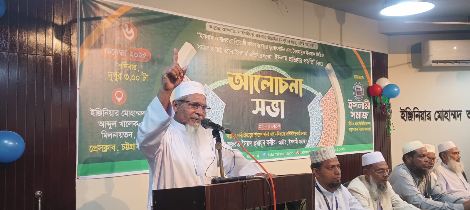 ‘ইসলামী সমাজ’ চট্টগ্রাম জেলা’র দায়িত্বশীল, মোঃ জামাল উদ্দিন এর সভাপতিত্বে “ইসলাম ও মানবতা বিরোধী সকল ব্যবস্থার মূলোৎপাটন এবং বৈষম্যমুক্ত ইনসাফ ভিত্তিক সমাজ ও রাষ্ট্র গঠনে ইসলাম প্রতিষ্ঠার লক্ষ্যে ইসলাম প্রতিষ্ঠার পদ্ধতি” বিষয়ে ০৬ ডিসেম্বর, শনিবার, বিকাল ৩ টায়, চট্টগ্রাম প্রেসক্লাবের ইঞ্জিনিয়ার মোহাম্মদ আব্দুল খালেক মিলনায়তনে অনুষ্ঠিত আলোচনা সভায়