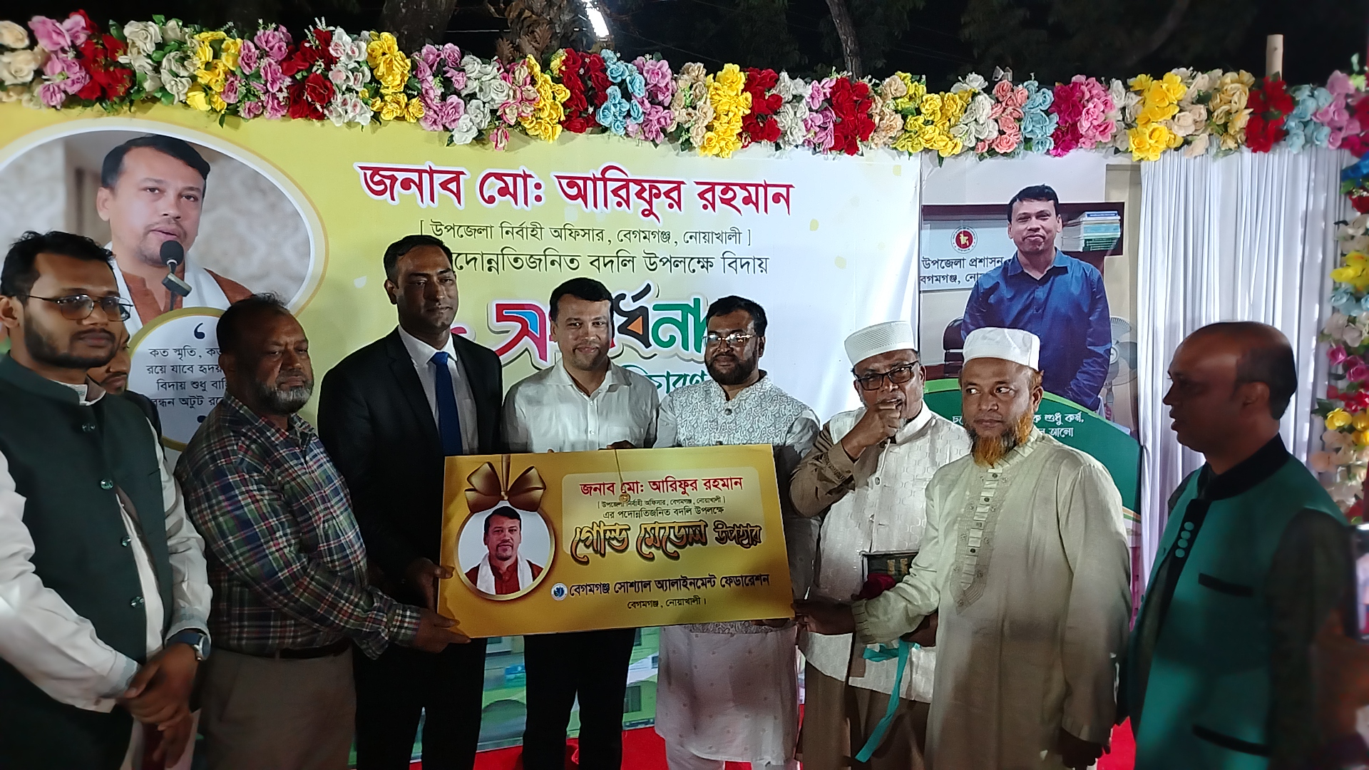 বেগমগঞ্জের উপজেলা নির্বাহী অফিসার মোঃ আরিফুর রহমানে গোল্ড মেডেল দিয়ে বিদায়ী সংবর্ধনা দিল সর্বস্তরের জনগণ। সাথে নতুন ইউএনও কায়েসুর রহমানকে ফুল দিয়ে বরণ করে নিলো বেগমগঞ্জের সর্বস্তরের জনগণ।