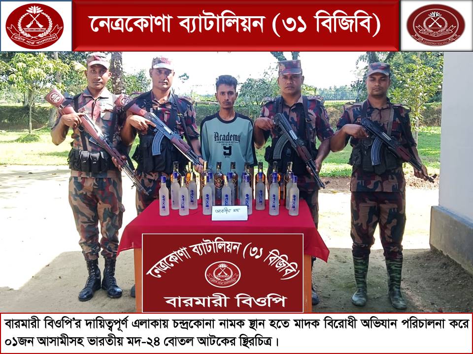 জব্দকৃত ২৪ বোতল বিভিন্ন ব্র্যান্ডের ভারতীয় মদের বোতলসহ আটককৃত আসামিকে দুর্গাপুর থানা পুলিশের কাছে হস্তান্তর কার্যক্রম প্রক্রিয়াধীন বলে জানান বিজিবি’র এই ঊর্ধ্বতন কর্মকর্তা।
