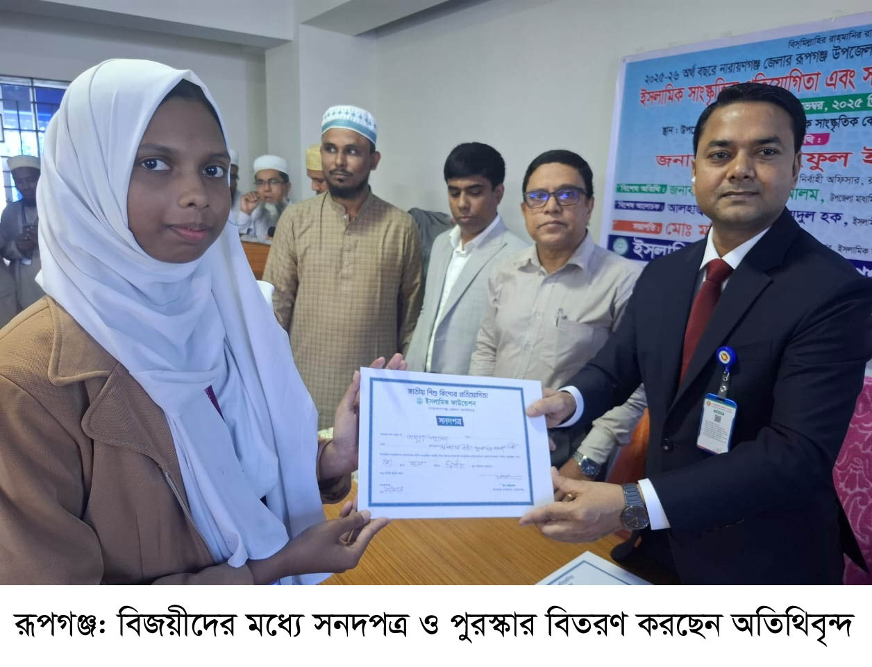 নারায়ণগঞ্জের রূপগঞ্জ উপজেলা পর্যায়ে জাতীয় শিশু-কিশোর ও ইসলামী সাংস্কৃতিক প্রতিযোগিতায় বিজয়ীদের মধ্যে সনদপত্র ও পুরস্কার বিতরণ করা হয়েছে। গতকাল ১৭নভেম্বর সোমবার উপজেলা মডেল মসজিদের সাংস্কৃতিক কেন্দ্রে ইসলামিক ফাউন্ডেশন কর্তৃক আয়োজিত পুরস্কার বিতরণী সভায় সভাপতিত্ব করেন ফাউন্ডেশনের ফিল্ড সুপারভাইজর মহিউদ্দিন।