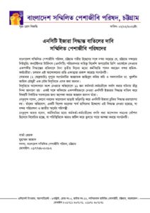 বাংলাদেশ সম্মিলিত পেশাজীবি পরিষদ, চট্টগ্রাম গভীর উদ্বেগের সঙ্গে লক্ষ্য করেছে যে, চট্টগ্রাম বন্দরের নিউমুরিং কনটেইনার টার্মিনাল (এনসিটি) পরিচালনার দায়িত্ব বিদেশি অপারেটর ডিপি ওয়ার্ল্ডকে দেওয়ার একপক্ষীয় সিদ্ধান্তের প্রতিবাদে টানা তৃতীয় দিনের মতো কর্মবিরতি পালন করছেন বন্দর শ্রমিক-কর্মচারীরা। চলমান এই আন্দোলনের প্রতি একাত্মতা প্রকাশ করেছে সংগঠনটি।