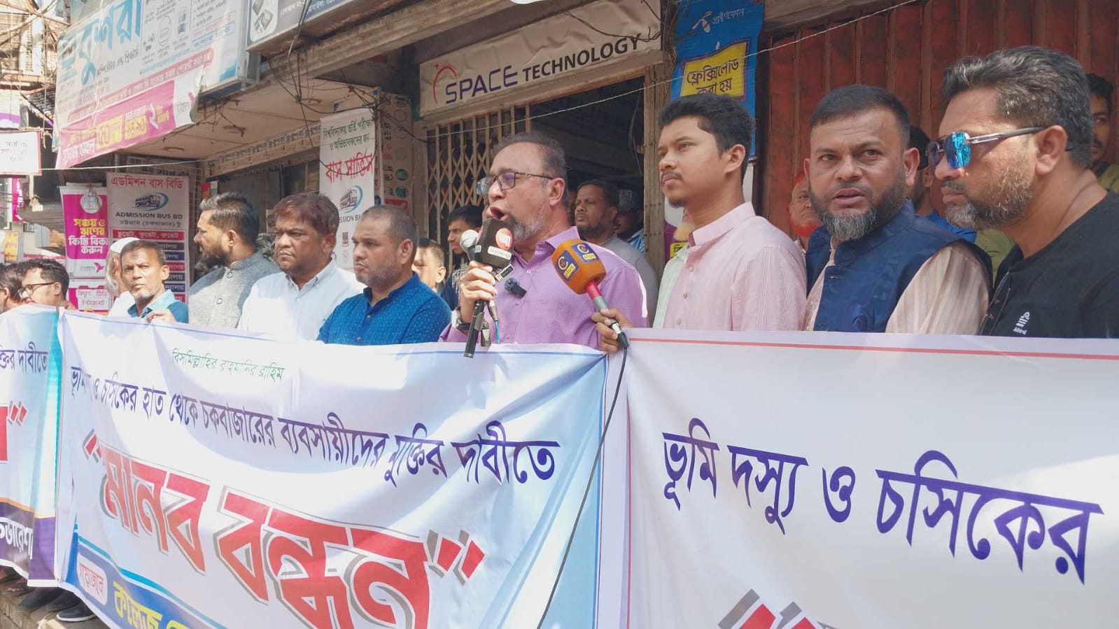 ভূমিদস্যুর কবল থেকে নগরীর চকবাজার কলেজ রোড ও লালচাঁন্দ রোড ব্যবসায়ীদের মুক্তির দাবিতে মানববন্ধন