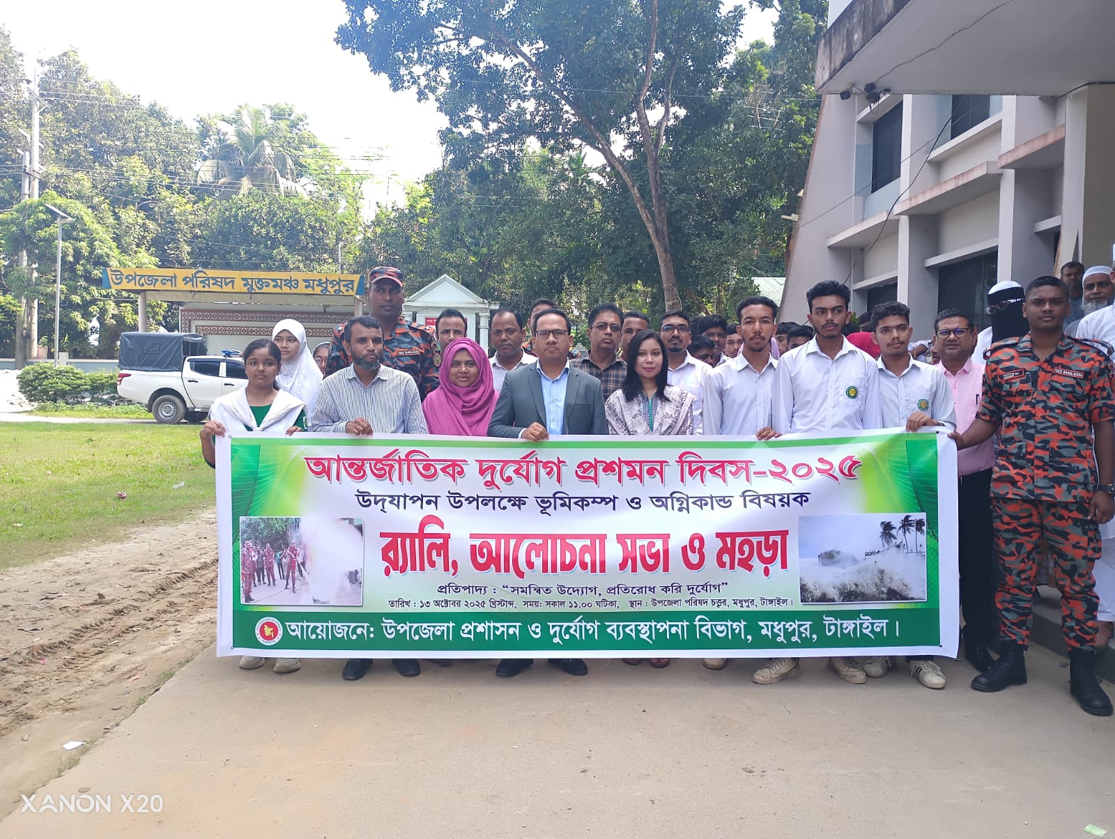 মধুপুর উপজেলা প্রশাসন ও দূর্যোগ ব্যবস্থাপনা বিভাগের আয়োজনে রোববার সকাল সাড়ে এগারটায় উপজেলা চত্বরে বর্ণাঢ্য র‌্যালী, ভূমিকম্প ও অগ্নিকান্ড বিষয়ক মহড়া শেষে আলোচনা সভা অনুষ্ঠিত হয়েছে।