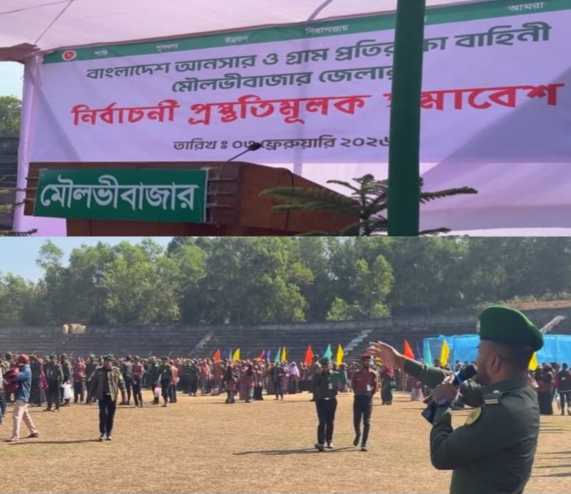 মৌলভীবাজার জেলায় আসন্ন জাতীয়/স্থানীয় নির্বাচনকে সামনে রেখে আনসার ও গ্রাম প্রতিরক্ষা বাহিনী, মৌলভীবাজার জেলা ইউনিটের উদ্যোগে মৌলভীবাজার জেলা এক নির্বাচনী প্রস্তুতিমূলক সমাবেশ অনুষ্ঠিত হয়েছে। মঙ্গলবার (৩ ফেব্রুয়ারি ২০২৬)মৌলভীবাজার জেলা স্টেডিয়ামে আয়োজিত এই সমাবেশে জেলার বিভিন্ন উপজেলা ও ইউনিয়ন পর্যায়ের আনসার ও ভিডিপি সদস্যরা অংশগ্রহণ করেন।