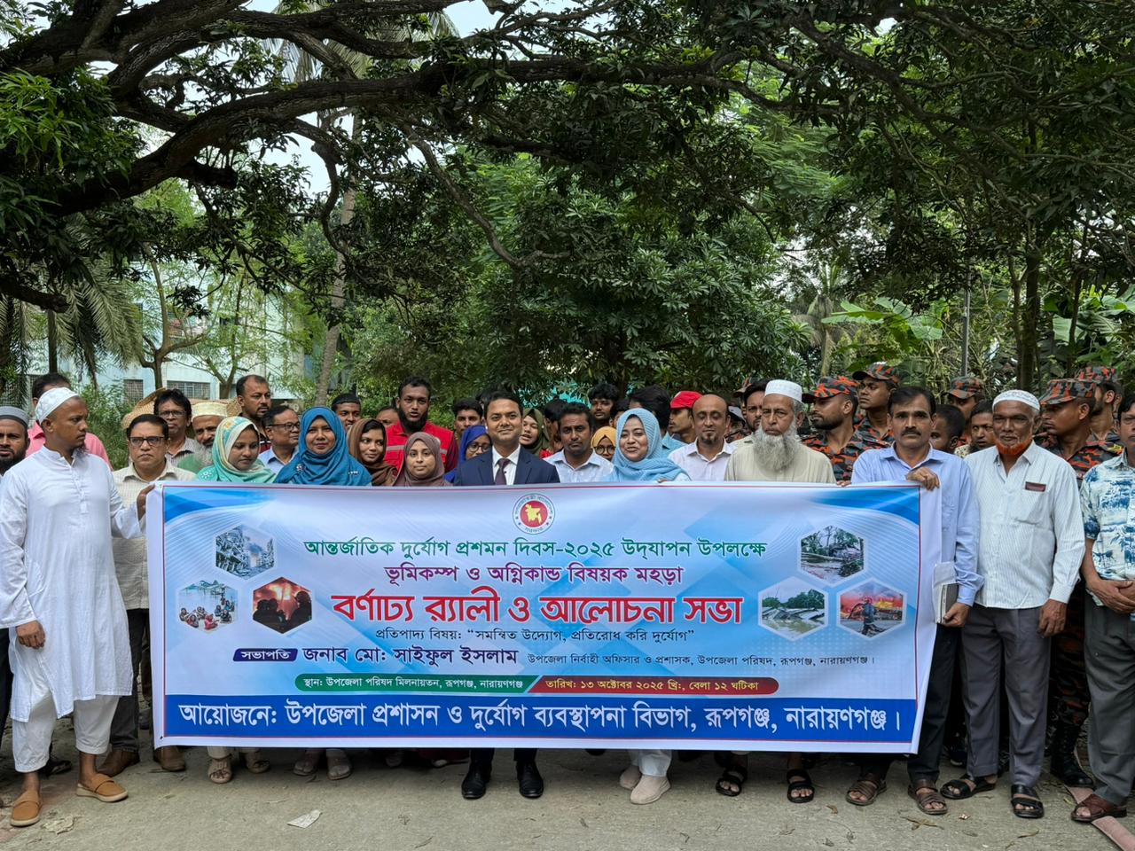 নারায়ণগঞ্জের রূপগঞ্জে আন্তর্জাতিক দূ্র্যোগ প্রশমন দিবস উপলক্ষে উপজেলা প্রশাসন ও দূ্র্যোগ ব্যবস্থপনা বিভাগের আয়োজনে র্যালী ও আলোচনা সভা অনুষ্ঠিত হয়েছে। সোমবার(১৩অক্টোবর) দুপুরে উপজেলা মিলনায়তনে এ সভা অনুষ্ঠিত হয়। এসময় র্যালীটি উপজেলা পরিষদ হয়ে বেশকয়েকটি সড়ক প্রদক্ষিণ করে।