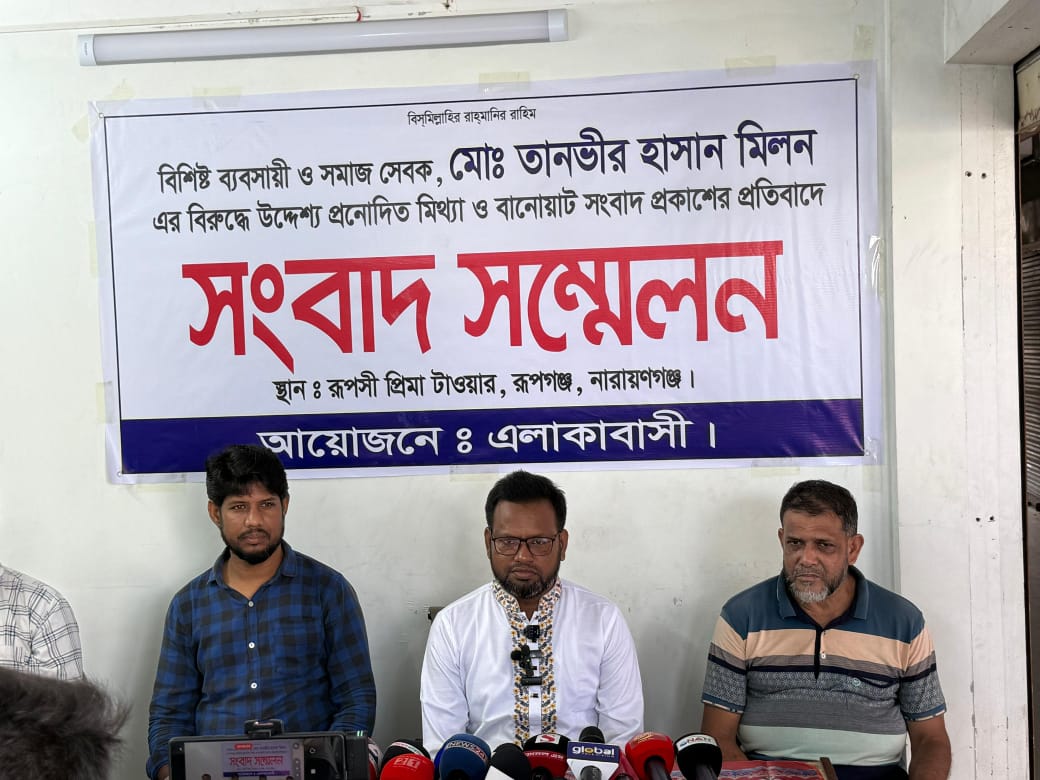 এসময় তানভীর হাসান মিলন বলেন, আমি একজন ব্যবসায়ী। দীর্ঘদিন ধরে সুনামের সাথে এশিয়ান ট্রেডার্স নামে একটি ব্যবসা প্রতিষ্ঠান পরিচালনা করে আসছি। স্থানীয় যুবলীগ নেতা রায়হান কবির সুমন আওয়ামী লীগের প্রভাব খাটিয়ে আমার জমি জোর পূর্বক দখল করে রেখেছিল। এটা নিয়ে সুমনের সঙ্গে আমার বিরোধ সৃষ্টি হয়। এ বিরোধের জের ধরে সুমন সন্ত্রাসী বাহিনী নিয়ে আমার বাড়িতে হামলা ও গুলি চালায়। এ ঘটনায় আমি রূপগঞ্জ থানায় মামলা দায়ের করি। মামলা উঠিয়ে নিতে সুমন আমাকে হুমকি ধামকি দিতে থাকে। গত ৫ ই আগষ্টের পর সুমন বিদেশে পালিয়ে যায়। সুমন বিদেশে থেকে আমার বিরুদ্ধে নানা ষড়যন্ত্র করতে থাকে। কয়েকদিন আগে আমার বিরুদ্ধে গোয়েন্দা ডায়েরী নামে একটি সাপ্তাহিক পত্রিকায় একটি মিথ্যা ও বানোয়াট সংবাদ প্রকাশ করে। আমি এ ঘটনার প্রতিবাদ জানাচ্ছি। আমি যুবলীগ নেতা সুমন ও সংশ্লিষ্ট পত্রিকার বিরুদ্ধে আইনী ব্যবস্থা গ্রহণ করবো। এছাড়া সুমনের নামে বৈষম্য বিরোধী ছাত্র আন্দোলনের হত্যাসমামলা রয়েছে।