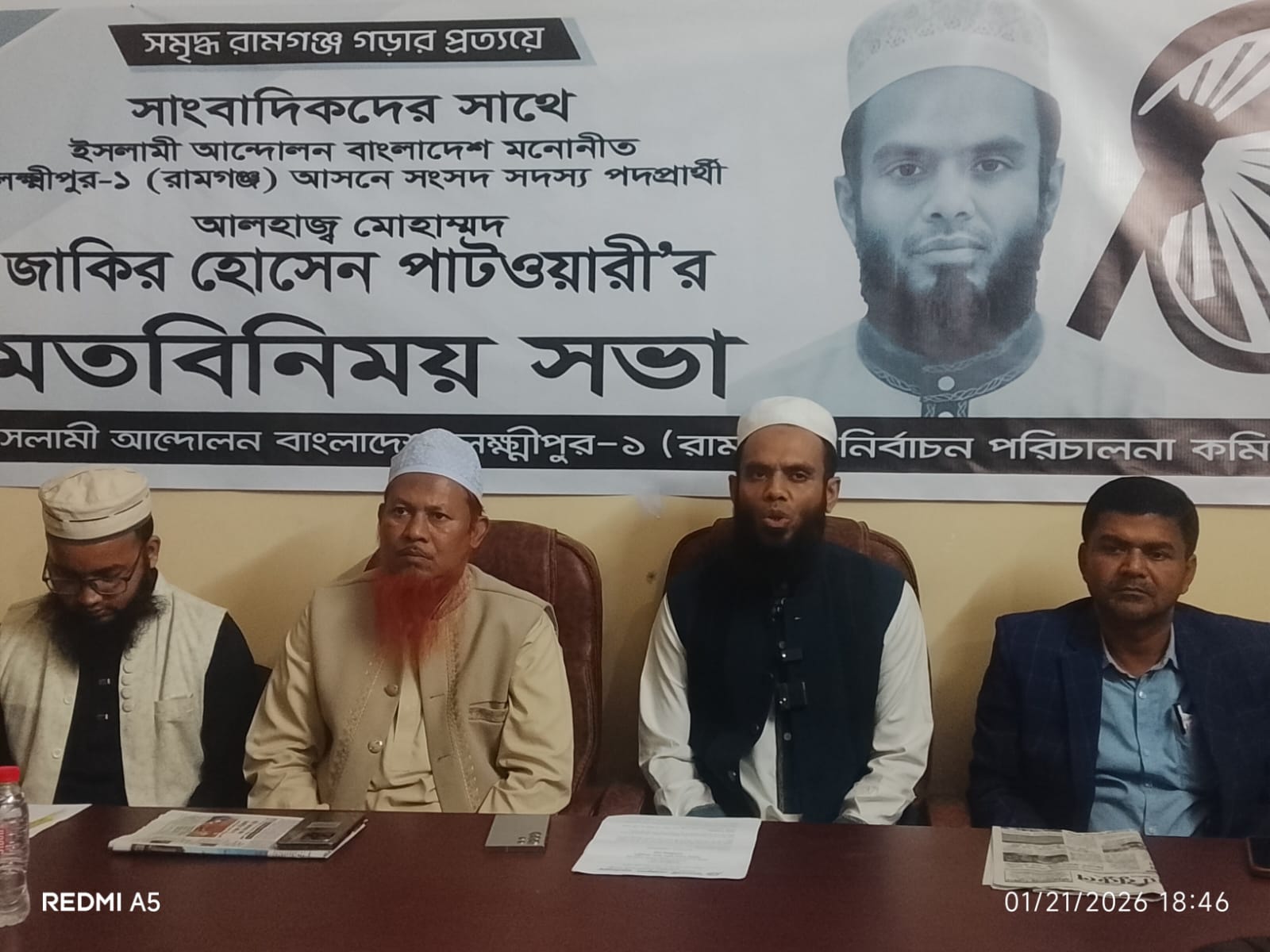 আসন্ন ত্রয়োদশ জাতীয় সংসদ নির্বাচনে লক্ষ্মীপুর-১ রামগঞ্জ আসনের হাতপাখা প্রতীকের প্রার্থী মোহাম্মদ জাকির হোসেন পাটোয়ারী বলেছেন, আমি একটি স্বচ্ছ জবাবদিহিমূলক, ও দুর্নীতিমুক্ত রাজনীতিতে বিশ্বাস করি। গণমাধ্যমকে ভয় নয়, আমি গণমাধ্যমকে শক্তি মনে করি, কারণ শক্তিশালী গণমাধ্যম ছাড়া সুশাসন সম্ভব নয়। তিনি বুধবার রাত রামগঞ্জ প্রেসক্লাবে রামগঞ্জে কর্মরত সাংবাদিকদের সাথে মতবিনিময় কালে এসব কথা বলেন। তিনি বলেন স্বাধীন সাংবাদিকতা ও সাংবাদিকদের লেখনীর মাধ্যমে সমাজের প্রতিটি স্তরে দায়িত্বশীলদের আরো দায়িত্বশীল ও জবাবদিহিতা করে তোলে।আমার রাজনীতি কাউকে আঘাত করার রাজনীতি নয়, আমার রাজনীতি বিভাজনের রাজনীতি নয়, আমার রাজনীতি হচ্ছে রামগঞ্জ কে নিরাপদ সমৃদ্ধ ও মানবিক রামগঞ্জে রূপান্তর করার রাজনীতি। আপনাদের মাধ্যমে আমি রামগঞ্জবাসীকে বলতে চাই আসুন অপপ্রচার ও বিভ্রান্তি নয়, কাজ সততা ও যোগ্যতার ভিত্তিতে সিদ্ধান্ত নেই।