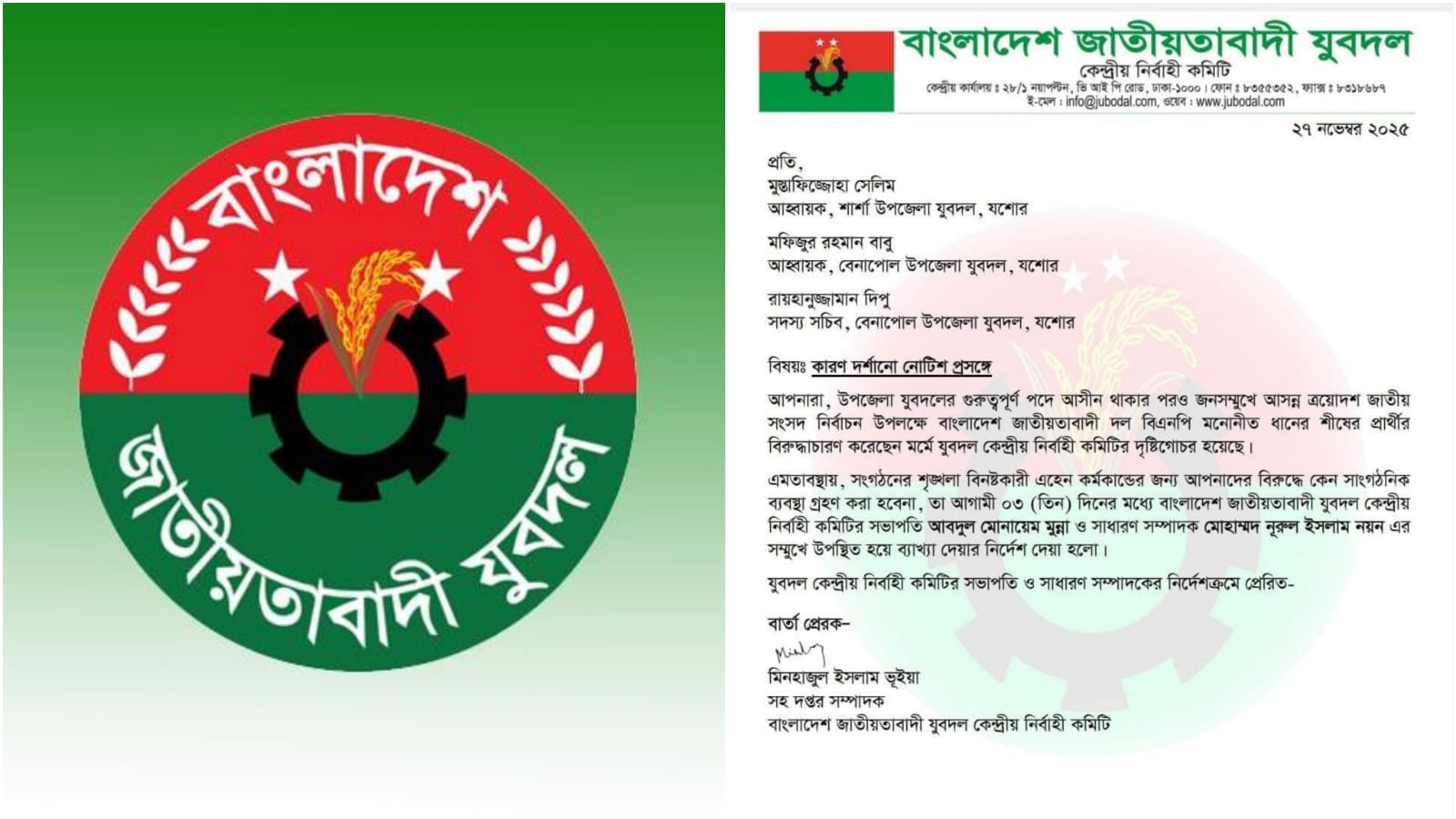 এমতাবস্থায়, সংগঠনের শৃঙ্খলা বিনষ্টকারী এহেন কর্মকান্ডের জন্য আপনাদের বিরুদ্ধে কেন সাংগঠনিক ব্যবস্থা গ্রহণ করা হবেনা, তা আগামী ০৩ (তিন) দিনের মধ্যে বাংলাদেশ জাতীয়তাবাদী যুবদল কেন্দ্রীয় নির্বাহী কমিটির সভাপতি আবদুল মোনায়েম মুন্না ও সাধারণ সম্পাদক মোহাম্মদ নূরুল ইসলাম নয়ন এর সম্মুখে উপস্থিত হয়ে ব্যাখ্যা দেয়ার নির্দেশ দেয়া হলো।