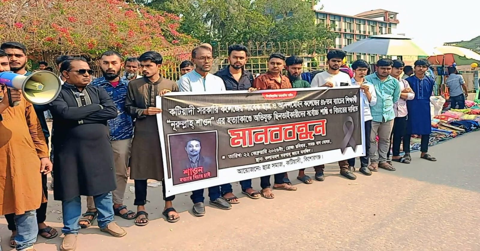 কিশোরগঞ্জের কটিয়াদীতে শিক্ষার্থী নুরুল্লাহ শাওন হত্যাকাণ্ডের সঙ্গে জড়িতদের গ্রেপ্তার ও দোষীদের দৃষ্টান্তমূলক শাস্তির দাবিতে মানববন্ধন ও বিক্ষোভ মিছিল অনুষ্ঠিত হয়েছে।