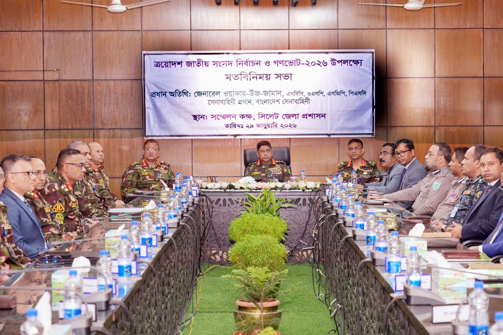 সফরকালে বৃহষ্পতিবার বিকেলে সেনাবাহিনী প্রধান সিলেট জেলা প্রশাসনের সম্মেলন কক্ষে উর্ধ্বতন পর্যায়ের সামরিক কর্মকর্তা, সিলেট বিভাগের সকল জেলার বিভিন্ন আইন-শৃঙ্খলা রক্ষাকারী বাহিনী ও অসামরিক প্রশাসনের কর্মকর্তাদের সাথে মতবিনিময় করেন। মতবিনিময়কালে, আসন্ন জাতীয় সংসদ নির্বাচনকে শান্তিপূর্ণ, নিরপেক্ষ ও সুষ্ঠুভাবে সম্পন্ন করার লক্ষ্যে আন্তঃপ্রাতিষ্ঠানিক সমন্বয় এবং সামগ্রিক নিরাপত্তা ব্যবস্থাপনা নিয়ে আলোচনা হয়। সেনাপ্রধান পেশাদারিত্ব, নিরপেক্ষতা, শৃঙ্খলা, ধৈর্য ও নাগরিকবান্ধব আচরণের মাধ্যমে দায়িত্ব পালনের উপর বিশেষ গুরুত্বারোপ করেন। এছাড়াও, পরিদর্শনকালে তিনি ‘ইন এইড টু সিভিল পাওয়ার’ এর আওতায় মোতায়েনকৃত সেনাসদস্যদের কার্যক্রম সরেজমিনে পর্যবেক্ষণ ও প্রয়োজনীয় দিকনির্দেশনা প্রদান করেন।