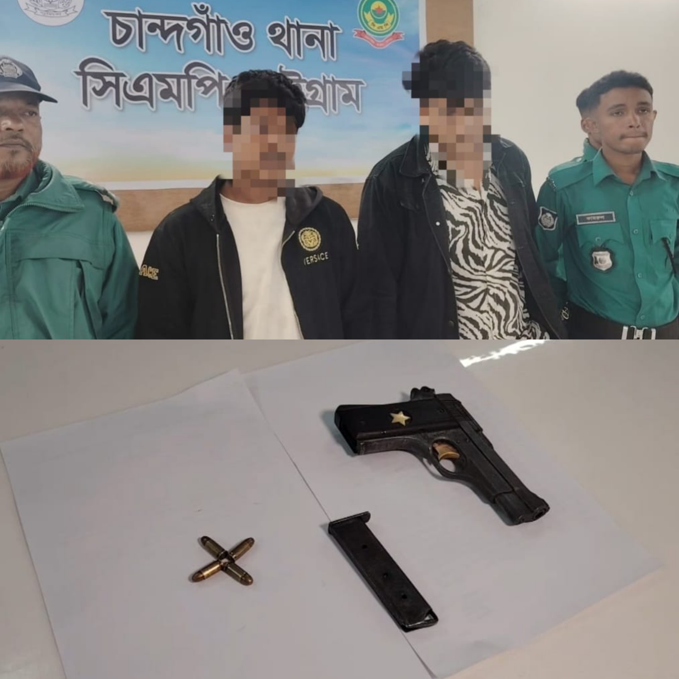 নগরীর চান্দগাঁও থানা পুলিশের অভিযানে ০১টি বিদেশী পিস্তল, ০১টি ম্যাগাজিন, ০৪ রাউন্ড তাজা গুলি ও ০১টি মোটরসাইকেল সহ ০২ জন গ্রেফতার
