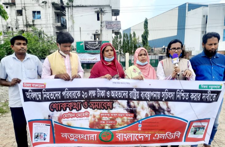 হাসেম ফুডে অগ্নিকান্ডে নিহতদের পরিবারকে ২০ লাখ টাকা ক্ষতিপূরণের দাবীতে নতুনধারার মানববন্ধন