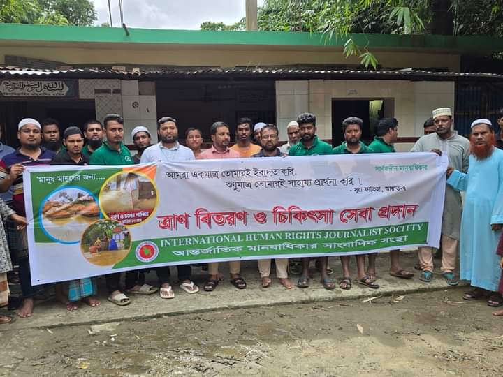 ত্রাণ বিতরণ করছেন আন্তর্জাতিক মানবাধিকার সাংবাদিক সংস্থার এর পক্ষে থেকে।।