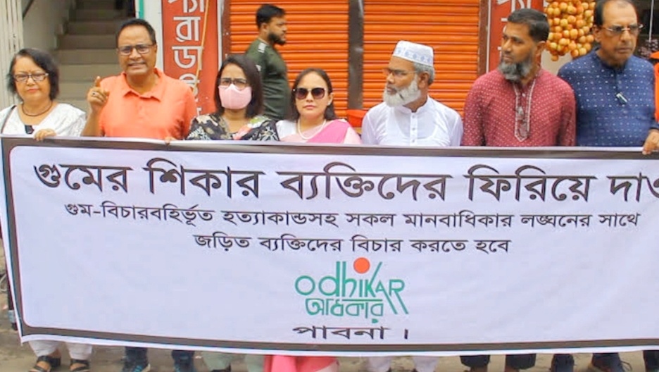 পাবনা প্রতিনিধি।। দেশে গুম হওয়া ব্যক্তিদের ফিরিয়ে দেওয়ার দাবিতে পাবনায় আন্তর্জাতিক মানবাধিকার সংগঠন অধিকারের উদ্যোগে মানববন্ধন