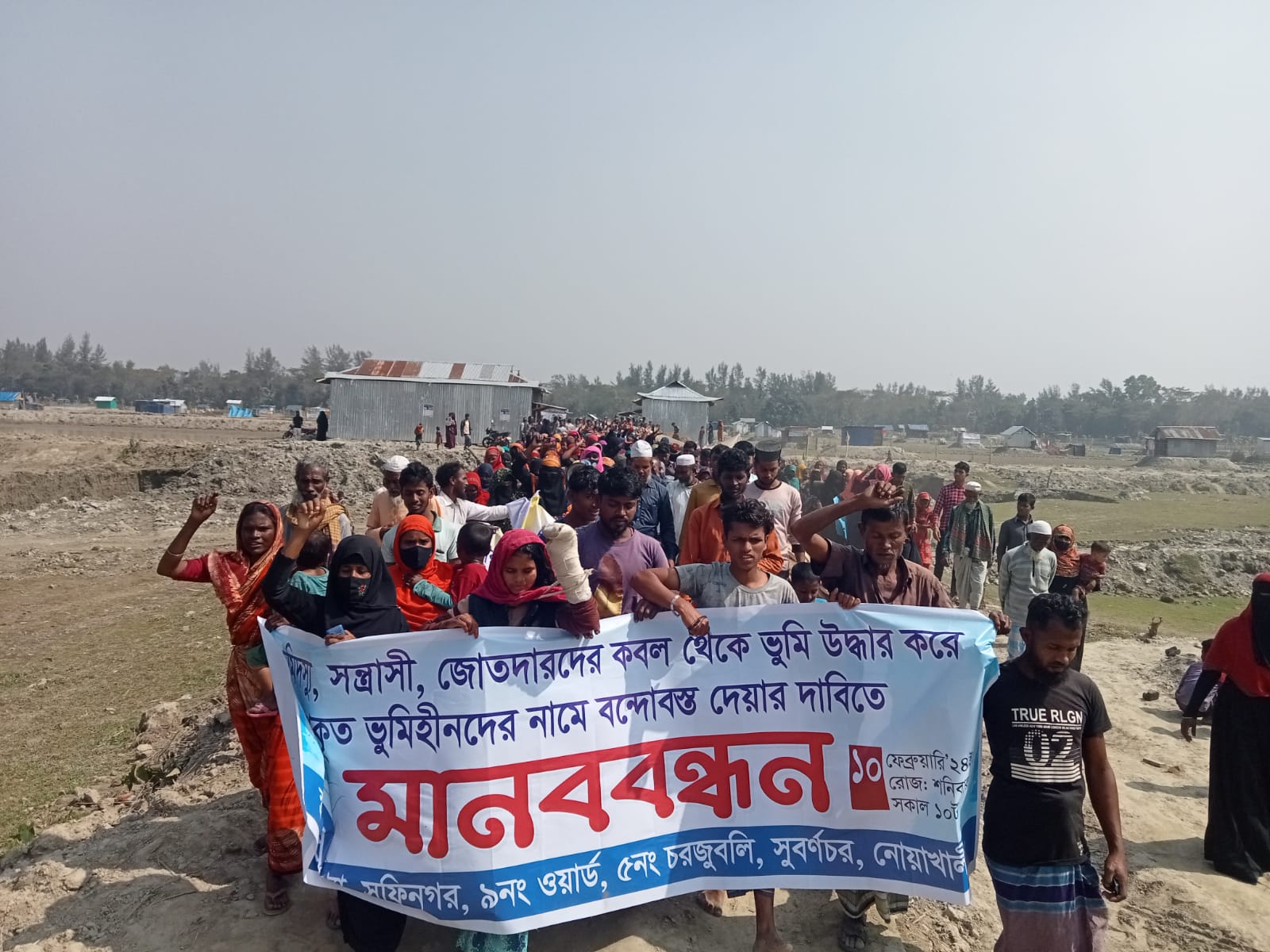 নোয়াখালী প্রতিনিধি।। নোয়াখালীর সুবর্ণচরে জোতদারদের কবল থেকে ভূমি উদ্ধার করে প্রকৃত ভূমিহীনদেন নামে বন্দোবস্ত দেয়ার দাবিতে মানববন্ধন ও বিক্ষোভ