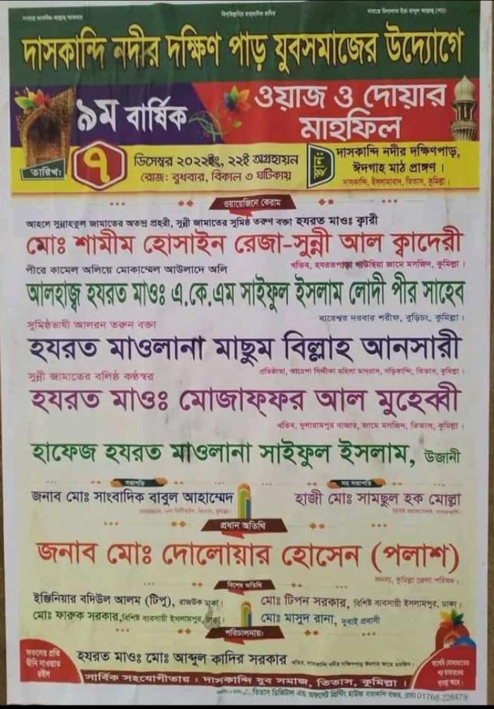 তিতাস-কুমিল্লা-প্রতিনিধি।। কুমিল্লার তিতাস উপজেলার ভিটিকান্দি ইউনিয়নের দাশকান্দিতে বার্ষিক ওয়াজ মাহফিল অনুষ্ঠিত হয়েছে।গত শনিবার রাতে অনুষ্ঠিত হয় দাশকান্দিতে বার্ষিক ওয়াজ মাহফিল।ওই