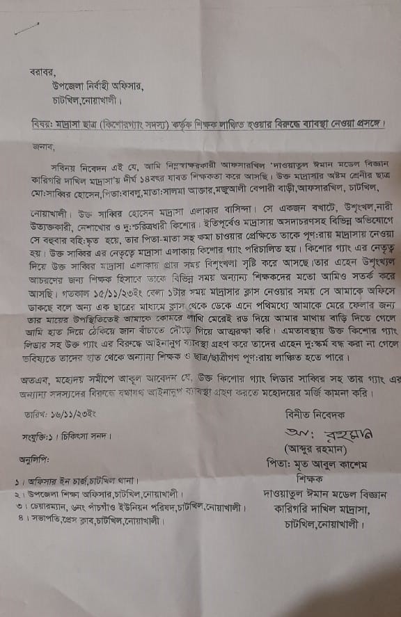 নোয়াখালী প্রতিনিধি।। নোয়াখালীর চাটখিলে অষ্টম শ্রেণির এক ছাত্রের মারধরের শিকার হয়েছেন শিক্ষক। বৃহস্পতিবার (১৬ নভেম্বর) ভুক্তভোগী শিক্ষক চাটখিল উপজেলা