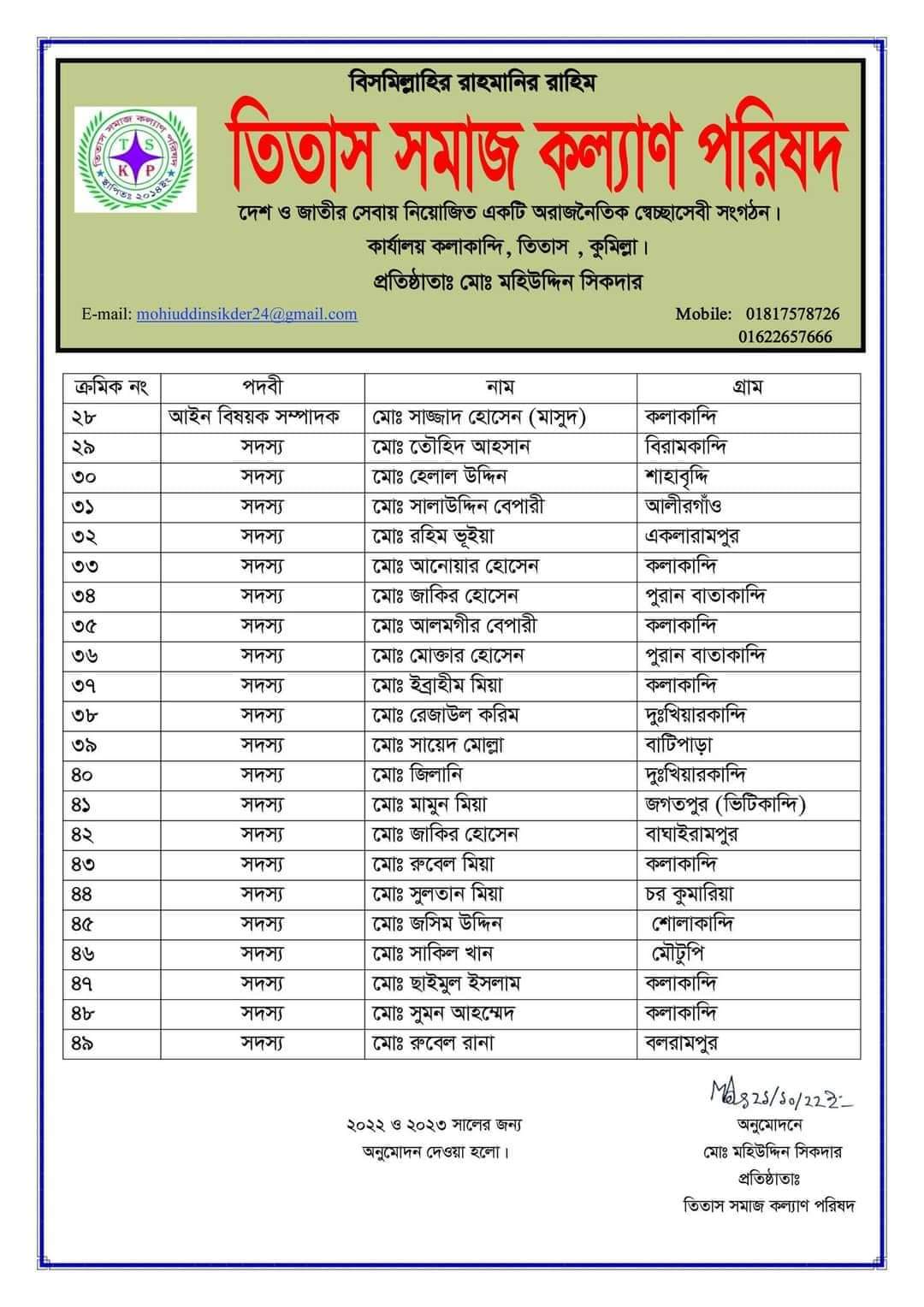 তিতাস সমাজ কল্যাণ পরিষদের কমিটিতে নির্বাচিত