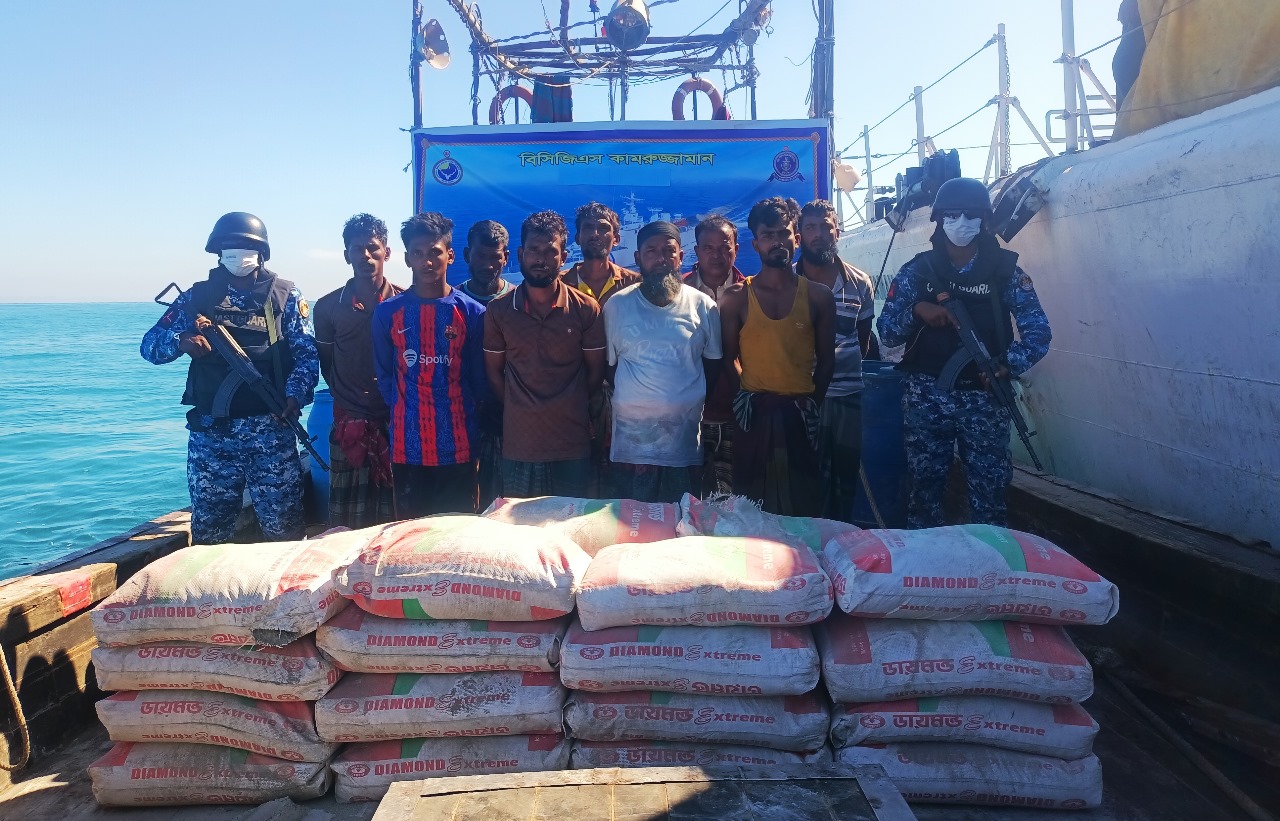 মায়ানমার হতে মাদকের বিনিময়ে বাংলাদেশী সিমেন্ট পাচারকালে ৯ চোরাকারবারীকে আটক করেছে কোস্ট গার্ড