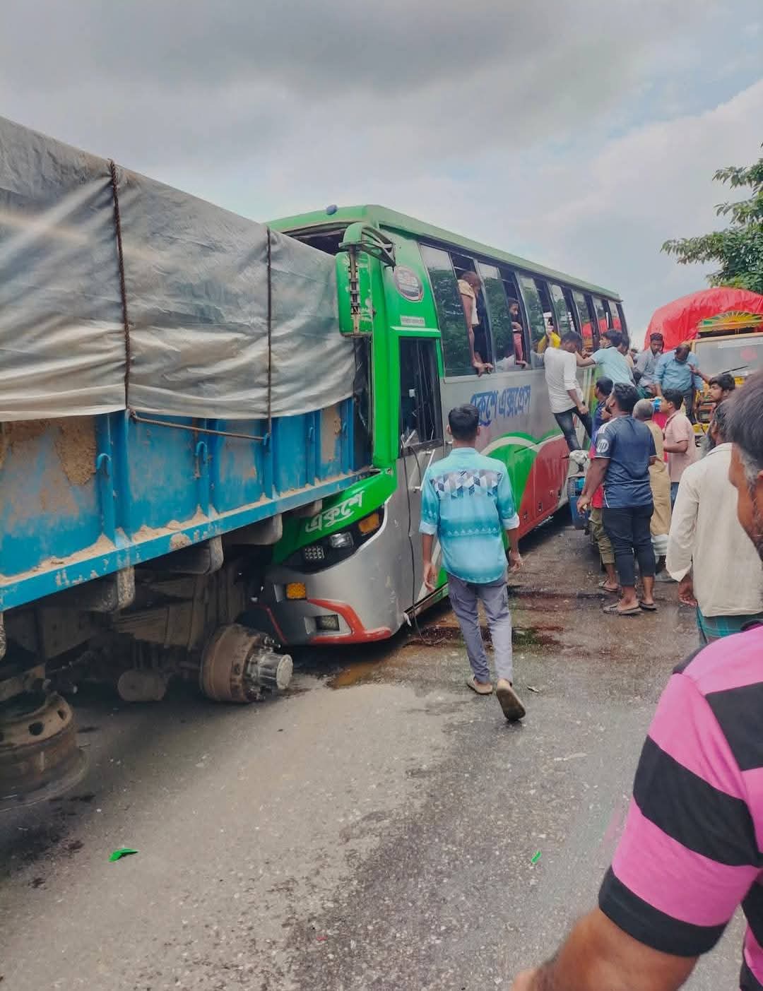নোয়াখালীর সোনাইমুড়ীতে দাঁড়িয়ে থাকা ট্রাকে বাসের ধাক্কা, চালক নিহত, আহত ১২