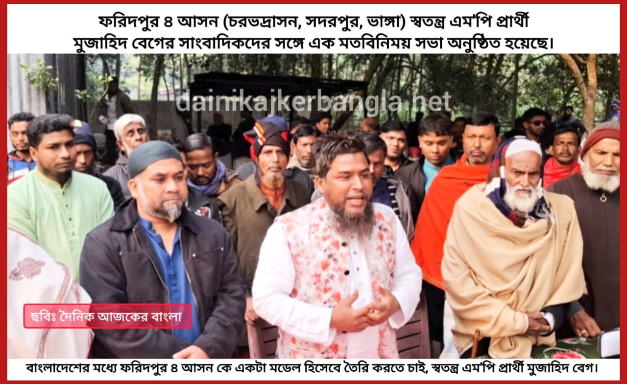 আহম্মেদ আল ইভান, স্টাফ রিপোর্টার: ফরিদপুর ৪ আসন (চরভদ্রাসন, সদরপুর, ভাঙ্গা) স্বতন্ত্র এম’পি প্রার্থী মুজাহিদ বেগের সাংবাদিকদের সঙ্গে এক মতবিনিময়